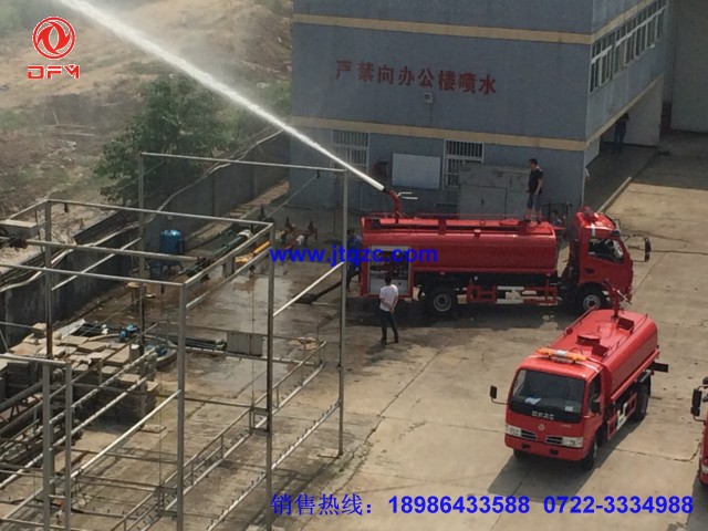 湖北江南專用特種汽車有限公司專門為小區(qū)、村鎮(zhèn)、糧庫、碼頭、校園、商場、工業(yè)園設(shè)計了一種簡易消防車又稱多功能灑水車,它有灑水車的前沖、后灑、側(cè)噴和工作平臺,它的前沖寬度能達(dá)到14米,側(cè)噴水炮射程可以達(dá)到24米。